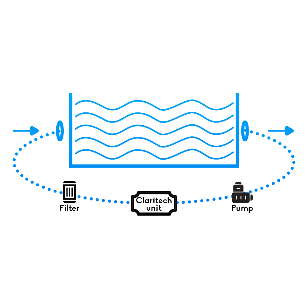 The Claritech water purification system uses copper-silver ionization to eliminate bacteria and viruses in water, by passing an electrical current through Copper and silver electrodes to create positively charged ions.